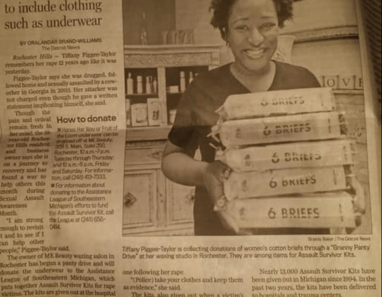 ME Beauty is partnering with SASHA Center Inc. of Detroit to ensure rape victims have access to new underwear when they are released from the hospital.